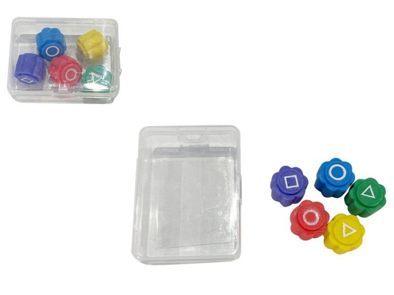 5 kolorowych kości:czerwona,zielona,żółta,niebieska,fioletowa.