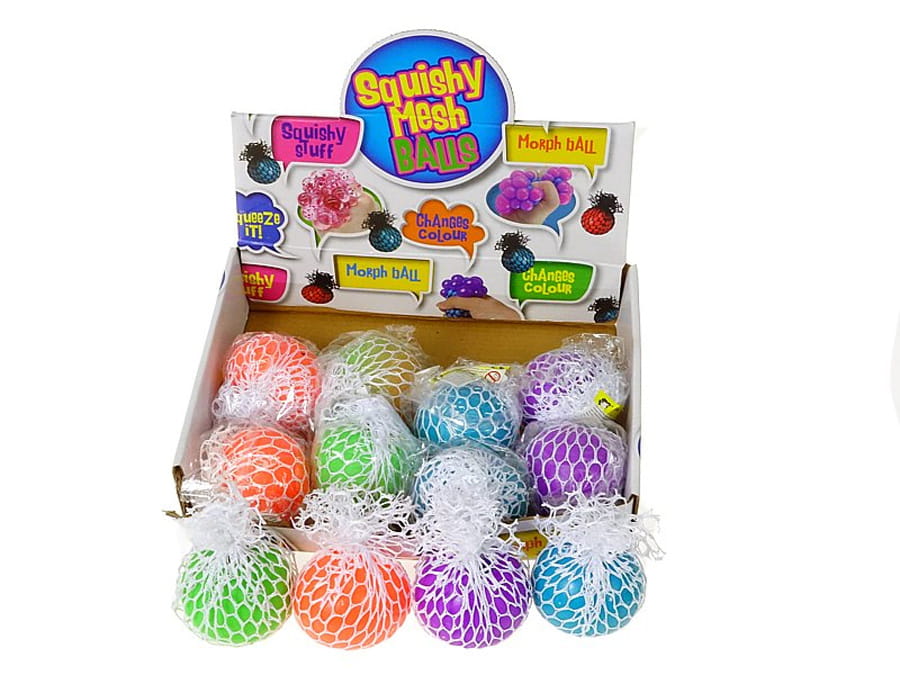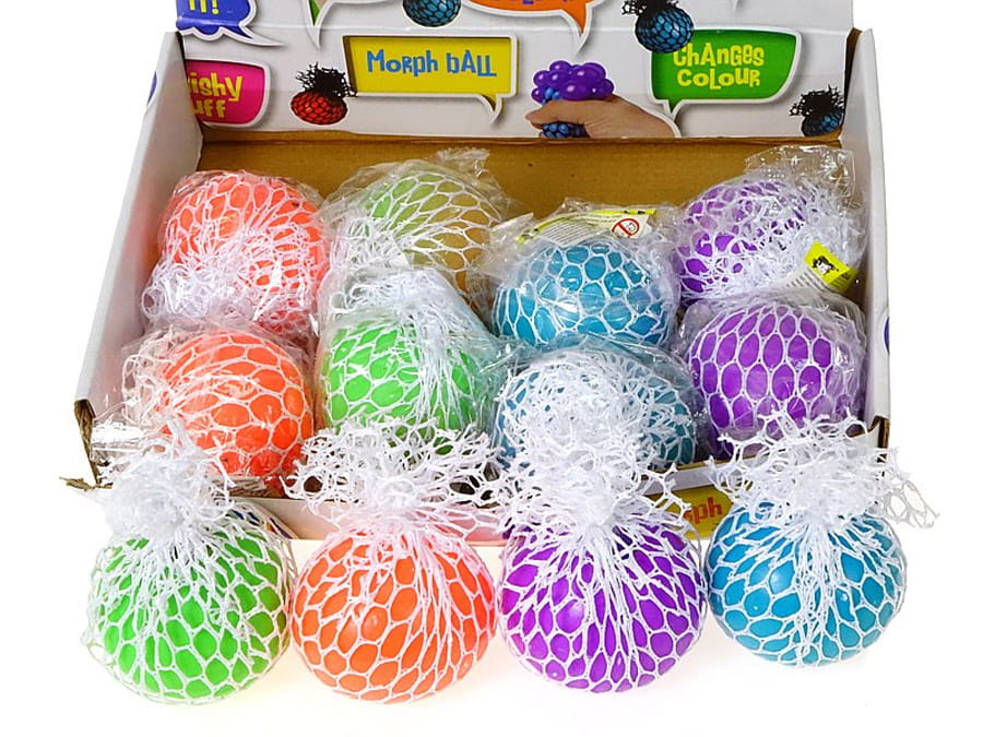 Gdy ściśnie się siatkową piłkę to pomiędzy oczkami siatki pojawiają się kolorowe, miniaturowe kuleczkii.